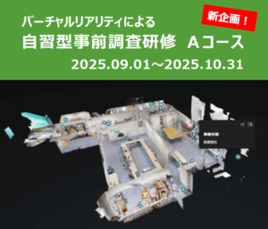| 9月1日(月)~ 10月31日(金) | バーチャルリアリティーによる 自習型事前調査研修 Aコース | 自習型(Web) | 受付終了 | 開催案内 |
