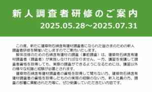 2025年度 新人調査者研修 を開催しました! 当協会では、毎年春から夏頃、新たに建築物石綿含有建材調査者になられた皆さまのための新人調査者研修を開催しております。解体改修のための石綿含有建材の調査(事前調査)は、建築物 […]