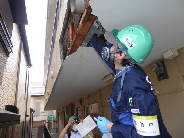 建築物の外部の調査では、屋根、軒天、外壁に使⽤されている材料を確認します。屋上の防⽔、外壁の建築⽤仕上塗材、煙突、ピロティ、庇(ひさし)などが調査すべき重要なポイントです