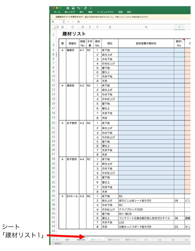 2.シート「建材リスト1」の記入