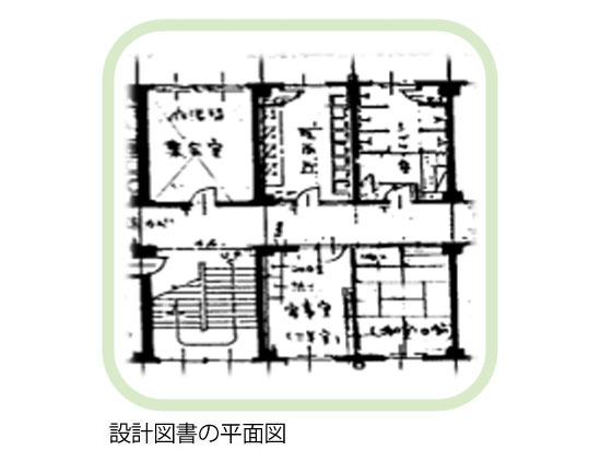 設計図書等には、設計図、確認申請図、竣⼯図、改修図等があります。⽊造⼀⼾建て住宅の場合には、設計図書がなくてもそれほど困りませんが、建築物の規模が⼤きくなるほど、設計図書の有無は調査の精度と現地調査でかかる⼿間と時間に影響します。可能な限り⼊⼿するように努⼒します。設計図書は所有者の許可を得て、画像ファイルにし、報告書などに添付します。